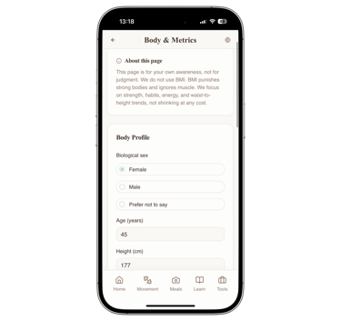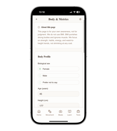 Body & Metrics (no BMI focus)